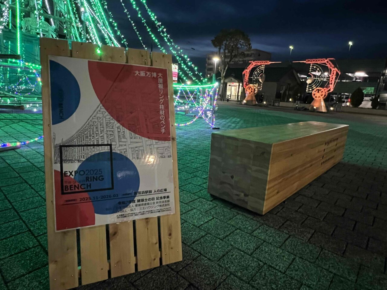 まず駅前にある人の広場は、駅を出てすぐの西側のオープンスペースが夜になると優しい光に包まれる人気スポット。木々や街路がライトアップされるだけでなく、そこに佇むのは大阪・関西万博で使われた大屋根リングの柱材を再利用したベンチ。